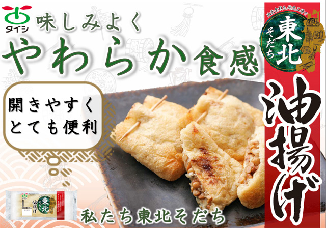 「東北そだち」シリーズに油揚げが仲間入り。選び抜いた東北産大豆と十和田奥入瀬伏流水仕込み。味しみよく、やわらかい食感が特徴です。開けるタイプの油揚げですので具材を詰めるお料理にもおすすめです。